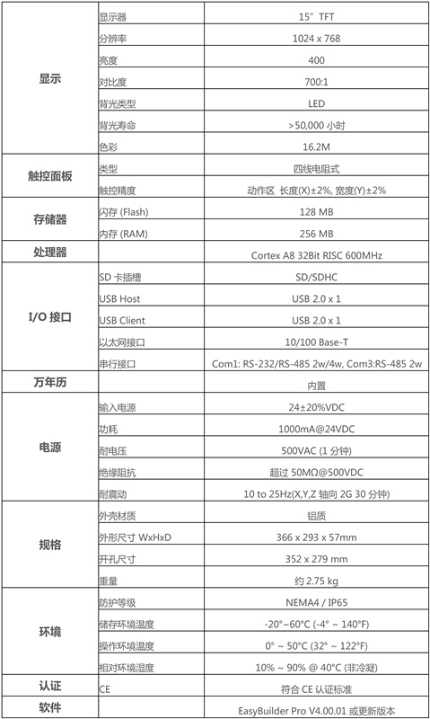 產(chǎn)品特點(diǎn) Installation 15" 1024x768 TFT LCD, LED 背光 無(wú)風(fēng)扇冷卻系統 內置128MB閃存 支持USB主設備與USB從設備 支持SD卡擴充儲存容量 COM1/COM3 RS485 內置隔離器 COM1及COM3 RS485 2W 支持MPI 187.5K同時(shí)間請選擇一使用 內置電源隔離器 NEMA4/IP65 前面板防護等級